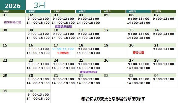 休診 日曜・祝日・木曜・土曜午後・第3火曜日 11時終了 |